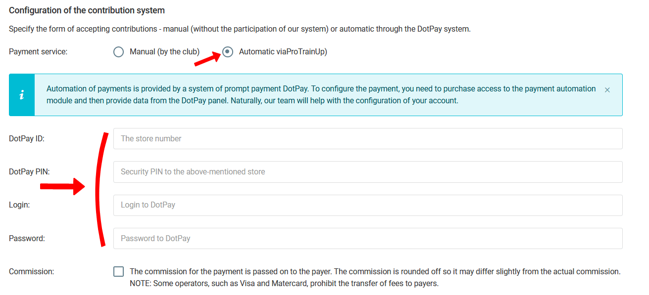 Třetí možností účtování v platebním systému je aktivace možnosti platit příspěvky přímo v systému ProTrainUp. Tato možnost je pak dostupná jak přes mobilní aplikaci, tak přes webový prohlížeč. Před aktivací této možnosti však musíte jménem klubu provést řadu formálních úkonů k vytvoření a autorizaci vašeho účtu DotPay.