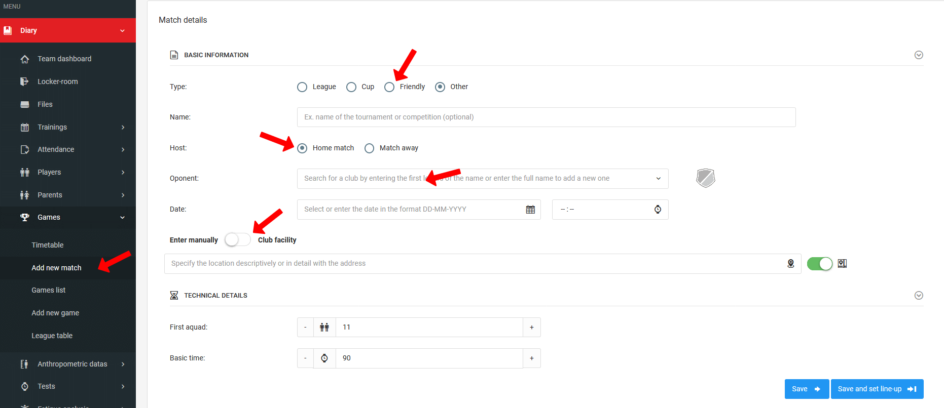 Pro přidání jednoho zápasu do vašeho rozvrhu klikněte v levém menu na deník zápasy přidat nový zápas. Po kliknutí na tento odkaz budete přesměrováni do okna pro vytvoření zápasu. Vyplňte několik polí, která se objeví ve formuláři. Nezapomeňte určit typ zápasu, soupeře, datum, čas a místo. Co se týče místa, můžete ho zadat ručně nebo použít předem definované objekty zadané z účtu administrátora. Po vyplnění všech polí uložte formulář a přejděte k sestavení sestavy pro zápas.