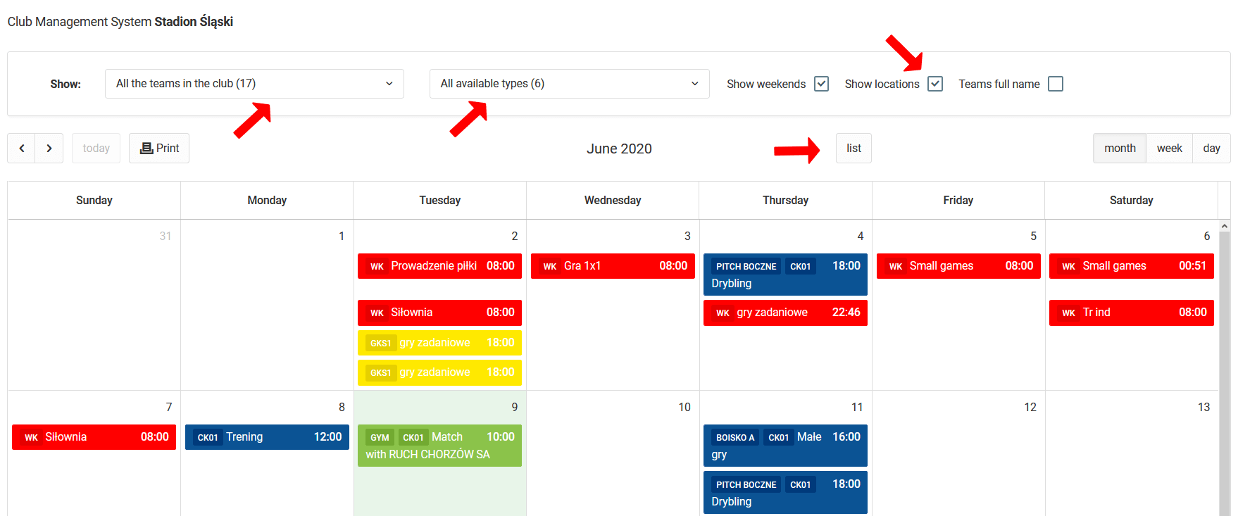Wie Sie im obigen Bild sehen können, gibt es über dem Kalender einen Bereich, in dem Sie mehrere Möglichkeiten haben, Ereignisse im Kalender zu filtern. Sie können den Bereich der angezeigten Ereignisse auf bestimmte Teams oder bestimmte Typen eingrenzen. Darüber hinaus können Sie entscheiden, ob Wochenenden, vollständige Teamnamen und Veranstaltungsorte im Kalender erscheinen sollen.