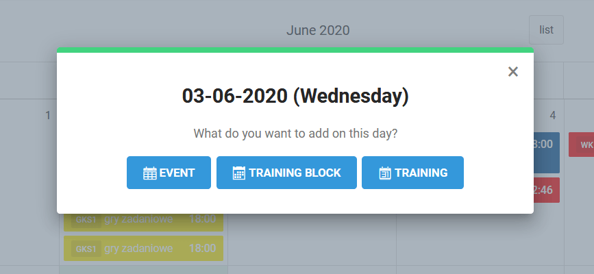 Als Systemadministrator haben Sie die Möglichkeit, drei Arten von Ereignissen zu Ihrem Vereinskalender hinzuzufügen. Traditionelles Ereignis, Trainingsblock und Training. Um ein Ereignis zum Kalender hinzuzufügen, klicken Sie auf einen beliebigen Tag im Kalender und wählen Sie eine der drei Optionen, die auf dem Bildschirm erscheinen.