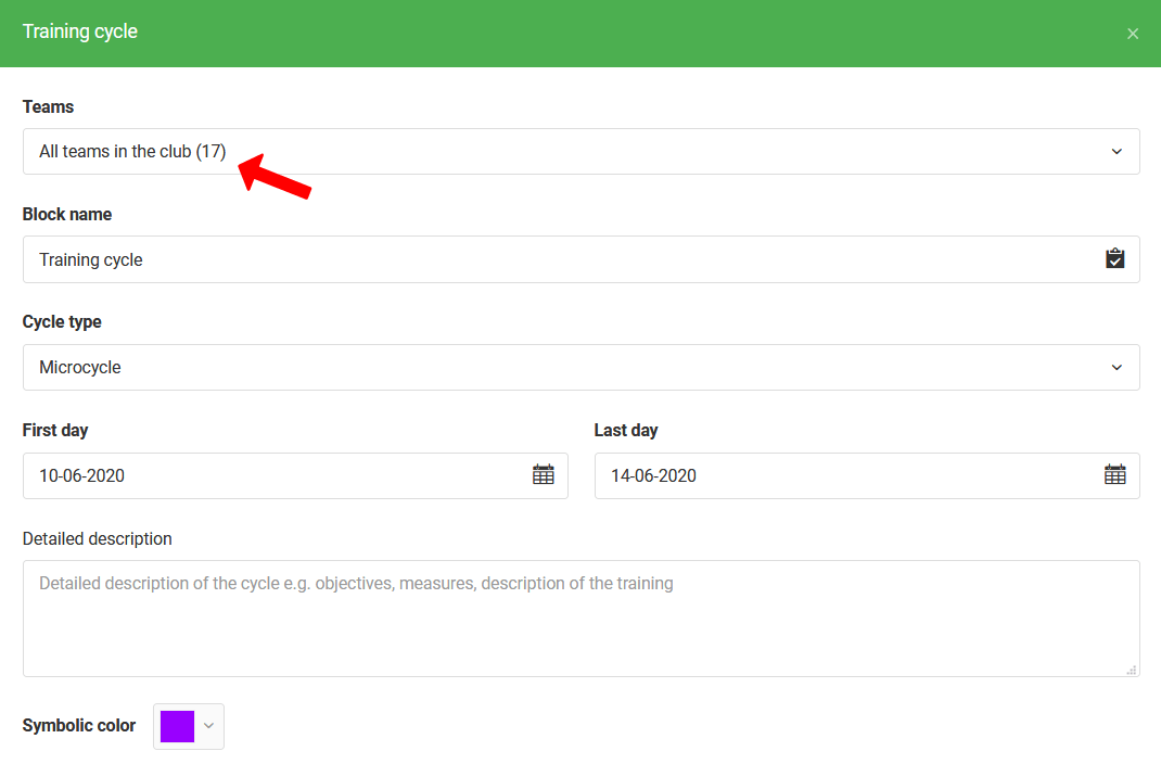 Die letzte Art von Ereignis, das Sie als Administrator zu Ihrem Kalender hinzufügen können, ist ein Trainingsblock. Dies ist ein äußerst wichtiges Element für die Planung Ihrer Arbeit im Verein. Es ermöglicht Ihnen, bestimmten Teams Mikrozyklen zuzuweisen. Der erste Schritt bei der Planung eines Trainingsblocks ist die Auswahl der Teams, für die Sie einen Mikrozyklus erstellen möchten. In den nächsten Schritten legen Sie den Namen, die Farbe, die Beschreibung und die Dauer des Trainingsblocks fest.