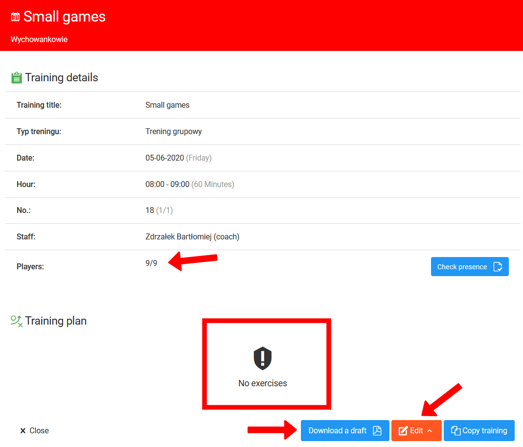 Eine weitere wichtige Funktion, die Sie in Ihrem Vereinskalender finden, ist die Möglichkeit, die Details jedes hinzugefügten Trainings zu kontrollieren. Wenn Sie im Kalender auf eine Trainingseinheit klicken, sehen Sie ein Fenster mit den Details der Einheit. Sehr schnell können Sie überprüfen, ob der Trainer einen Entwurf vorbereitet oder die Anwesenheit kontrolliert hat.