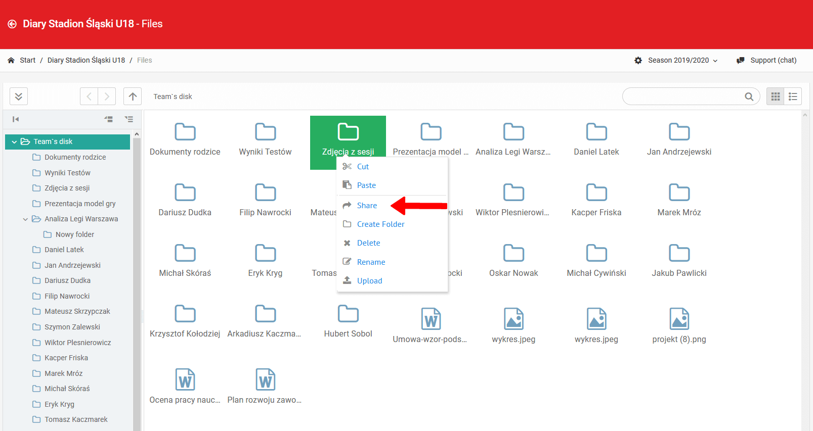 Die Inhaber der entsprechenden Lizenz erhalten Zugang zum Dokumentenverwaltungsmodul. Es besteht aus zwei Elementen. Das erste ist eine Festplatte, die nur für Mitarbeiter sichtbar ist. Das zweite sind die Dateien, auf die Spieler, Eltern und Mitarbeiter eines bestimmten Teams Zugriff haben. Auf der Ebene der Teamdateien hat das Personal die Möglichkeit, bestimmte Ordner mit ausgewählten Benutzergruppen (Spieler, Eltern) zu teilen.