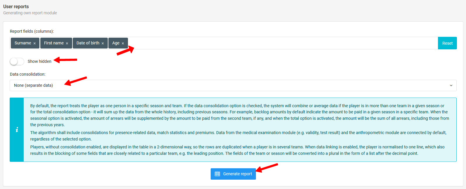 Um Ihren eigenen Bericht zu erstellen, geben Sie die Daten ein, die Sie dem Berichtsfeld (Spalte) hinzufügen möchten. Wenn Sie mit dem Hinzufügen von Spalten zum Bericht fertig sind, können Sie zwei zusätzliche Details angeben. Das erste ist, ob der Bericht verborgene Spieler einschließen soll, und das zweite ist die Konsolidierung der Daten. Hier entscheiden Sie, ob die Daten eines Spielers nur für eine Saison, für ein Team oder für alle Daten dieses Spielers gesammelt werden sollen.