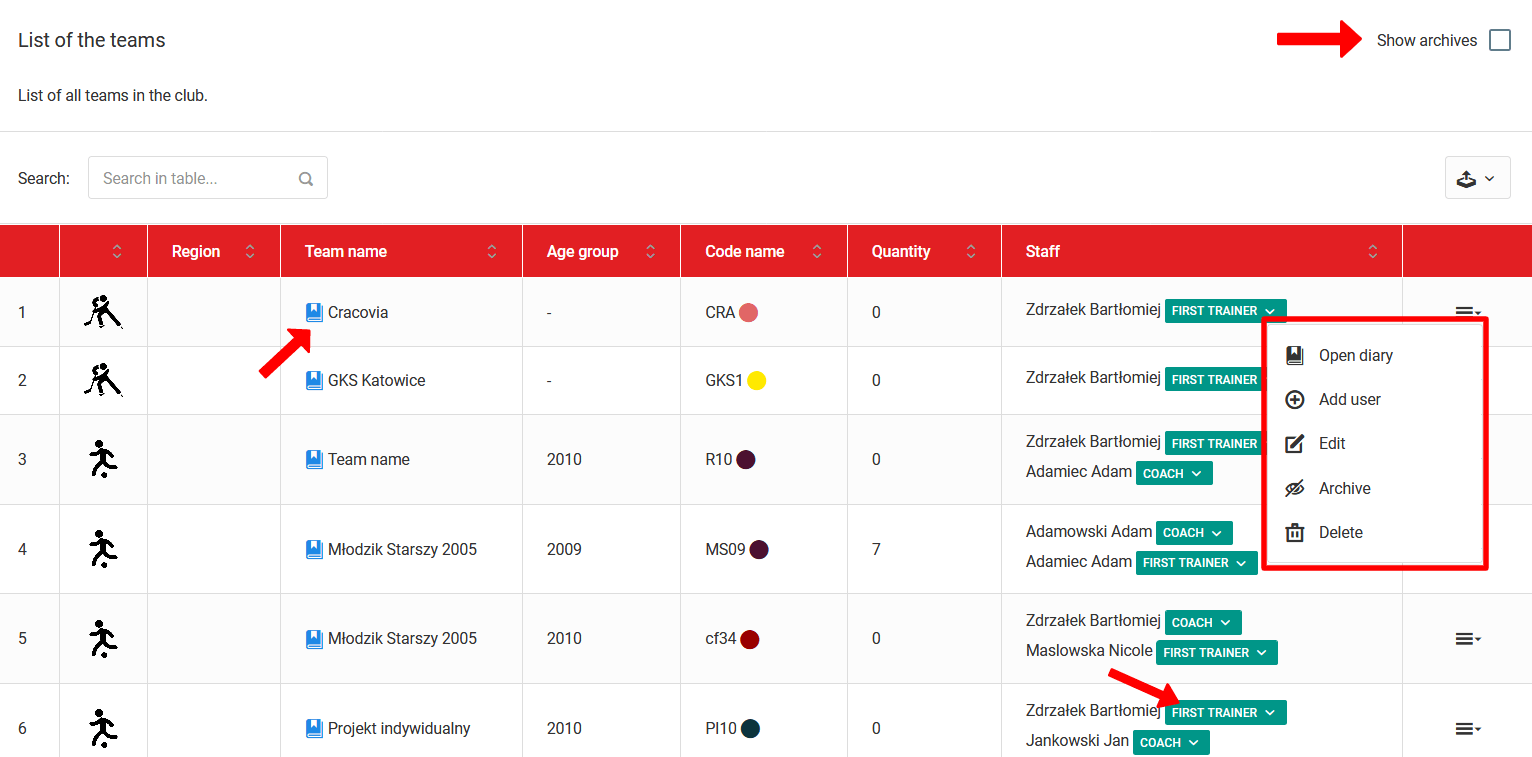 Después de llegar a la lista de equipos, verás todos los equipos en tu club. Esta pestaña contiene muchas oportunidades importantes que son cruciales para tu club. La primera posibilidad es la opción de previsualizar el diario de cada equipo. Para hacer esto, haz clic en el icono azul junto al nombre del equipo. Después de hacer clic en el icono, serás redirigido al diario del equipo seleccionado. La segunda opción importante es asignar un entrenador al equipo. Para agregar los permisos para un entrenador a un diario en particular, selecciona la opción del menú (última columna): "agregar usuario". Luego verás una ventana emergente con una lista de miembros del personal y una lista de roles que el miembro del personal puede desempeñar en el equipo. Recuerda, para dar al entrenador acceso completo al diario, asígnale el rol de primer entrenador o entrenador. Otros tipos de roles son de solo lectura. Para editar un rol en el equipo, haz clic en el cuadro verde junto al nombre del miembro del personal y selecciona un nuevo rol de la lista.