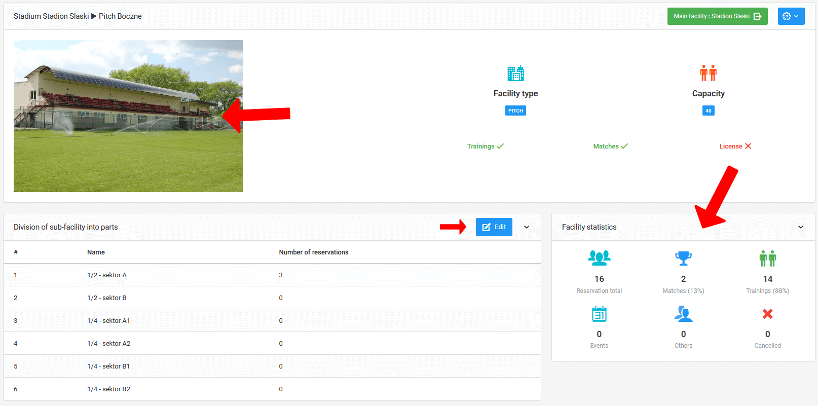 მოცემული ქვე-ობიექტის გადახედვისას შეგიძლიათ ნახოთ ყველაზე მნიშვნელოვანი ინფორმაცია: საკონტაქტო მონაცემები, ფოტო და დატვირთულობის სტატისტიკა. აქედან ასევე გაქვთ შესაძლებლობა დაყოთ ქვე-ობიექტი, მაგალითად, მოედნები ზონებად, რაც ნიშნავს, რომ ერთი მოედანი შეიძლება დაიყოს ორ ნახევრად.