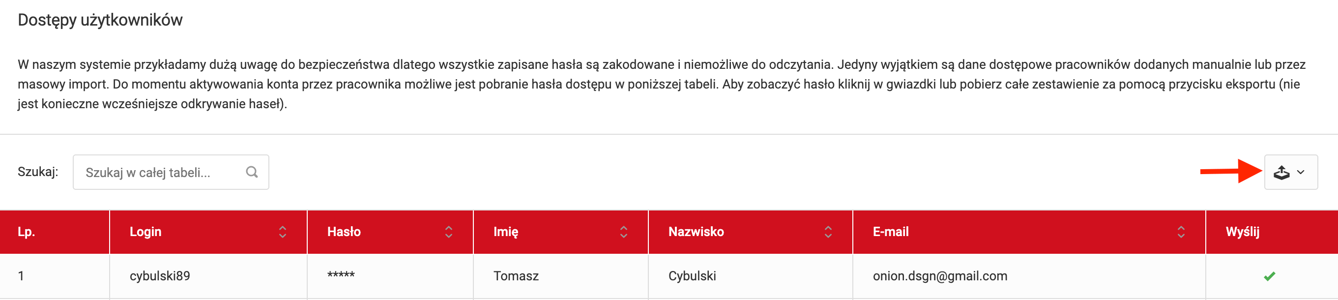 Po utworzeniu kont pracowników, ich loginy i hasła do systemu znajdziesz w zakładce klub pracownicy dane dostępowe. Dane mogą zostać przekazane w postaci tradycyjnej, papierowej pobierając dane do pliku PDF. Aby to zrobić, kliknij myszką w prawym górnym rogu w ikonkę eksportu danych do pliku. Możesz także wysłać indywidualną wiadomość e-mail do pracownika z danymi dostępowymi, klikając w niebieską ikonkę w ostatniej kolumnie tabeli.