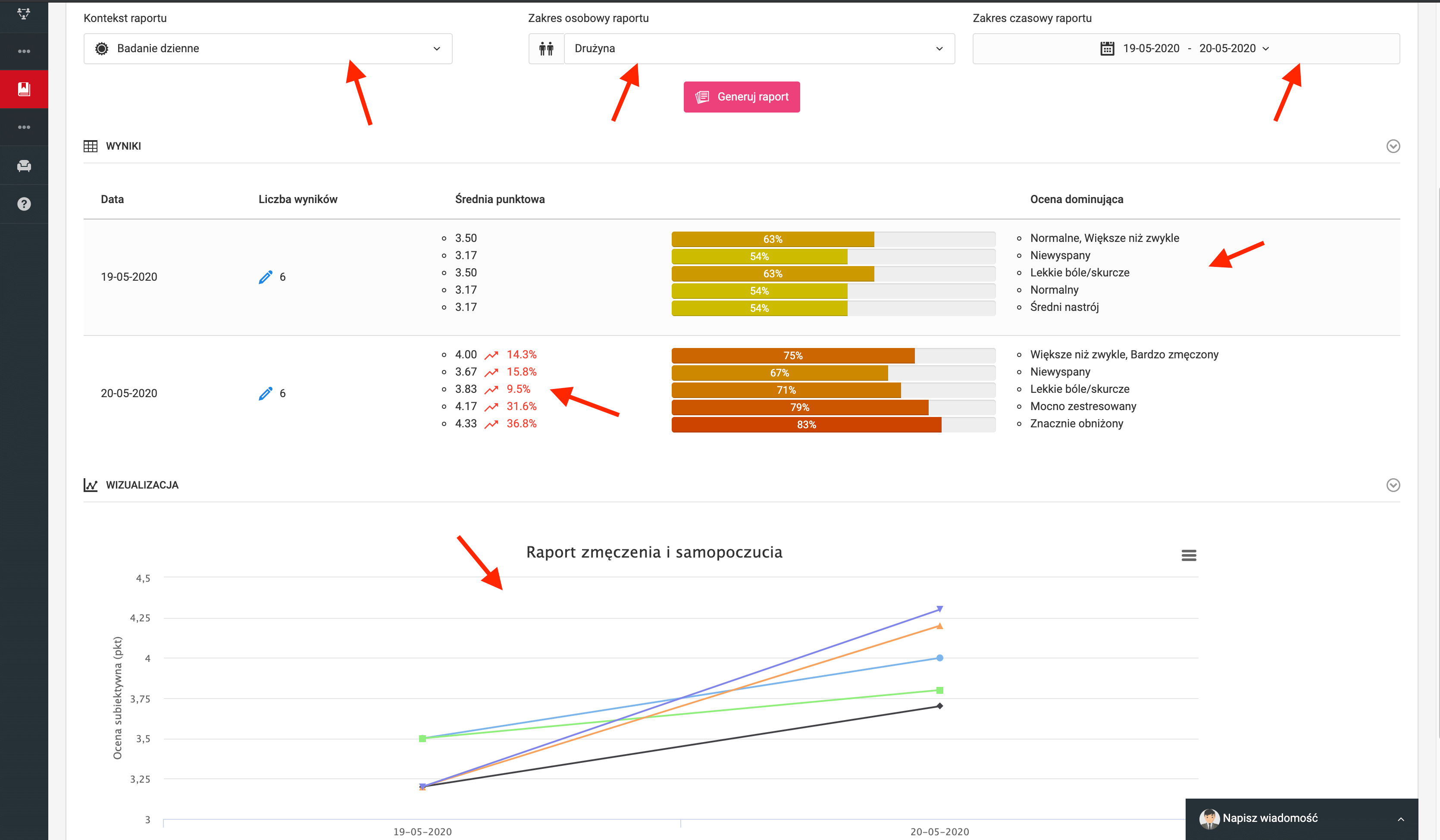 Wyniki przedstawione w raportach dostarczają Ci analizy zarówno jednostkowej, per każdy pomiar (dzień, trening, mecz) oraz zbiorcze zestawienia w postaci wykresów agregujących dane na jednej osi czasu. Ponadto analiza przedstawią procentową zmianę wyników względem ostatniego przeprowadzonego badania oraz dominującą odpowiedź wśród zawodników.