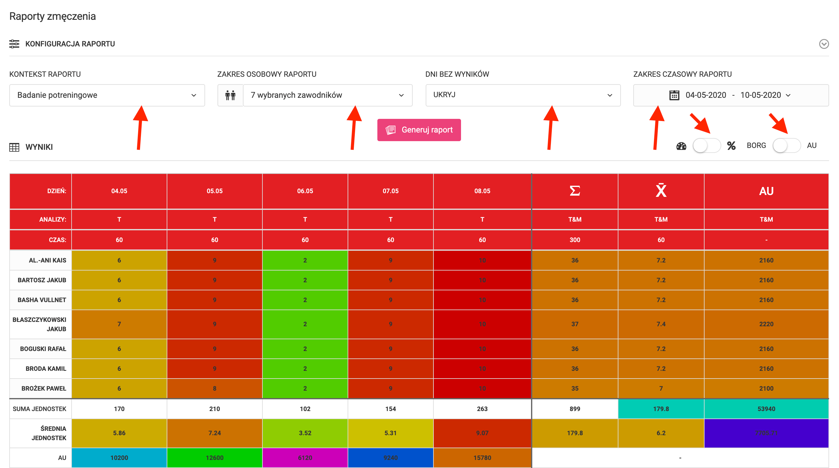 Po prawej stronie nad tabelą masz dwa suwaki, które wpływają na sposób prezentacji danych. Pierwszy z nich odpowiedzialny jest za zmianę sposoby obliczania wyników - do wyboru masz wartość liczbową lub procentową. W drugim suwaku ustalasz czy dane mają być przedstawione w formie wartości określonej skali lub jako obliczone jednostki zmęczeniowe (AU).