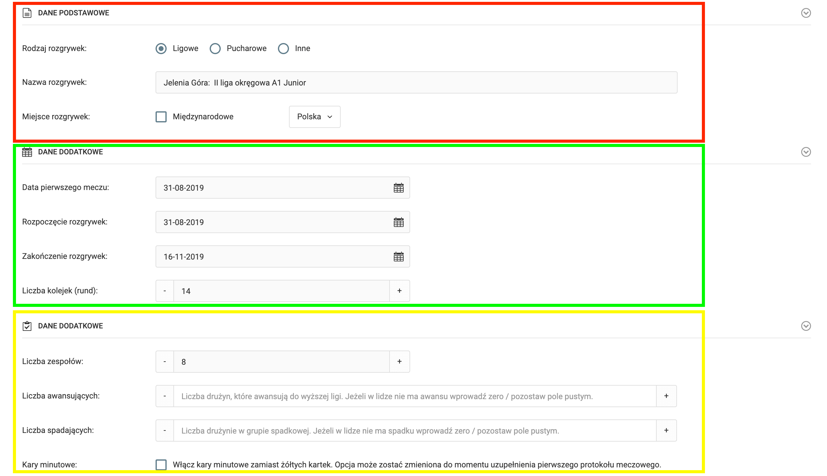 Druga opcja, to standardowe ręczne wprowadzenie wszystkich danych do formularza tworzenia rozgrywek. Na bazie tych danych oraz listy drużyn, utworzone zostaną rozgrywki wraz z terminarzem meczów.