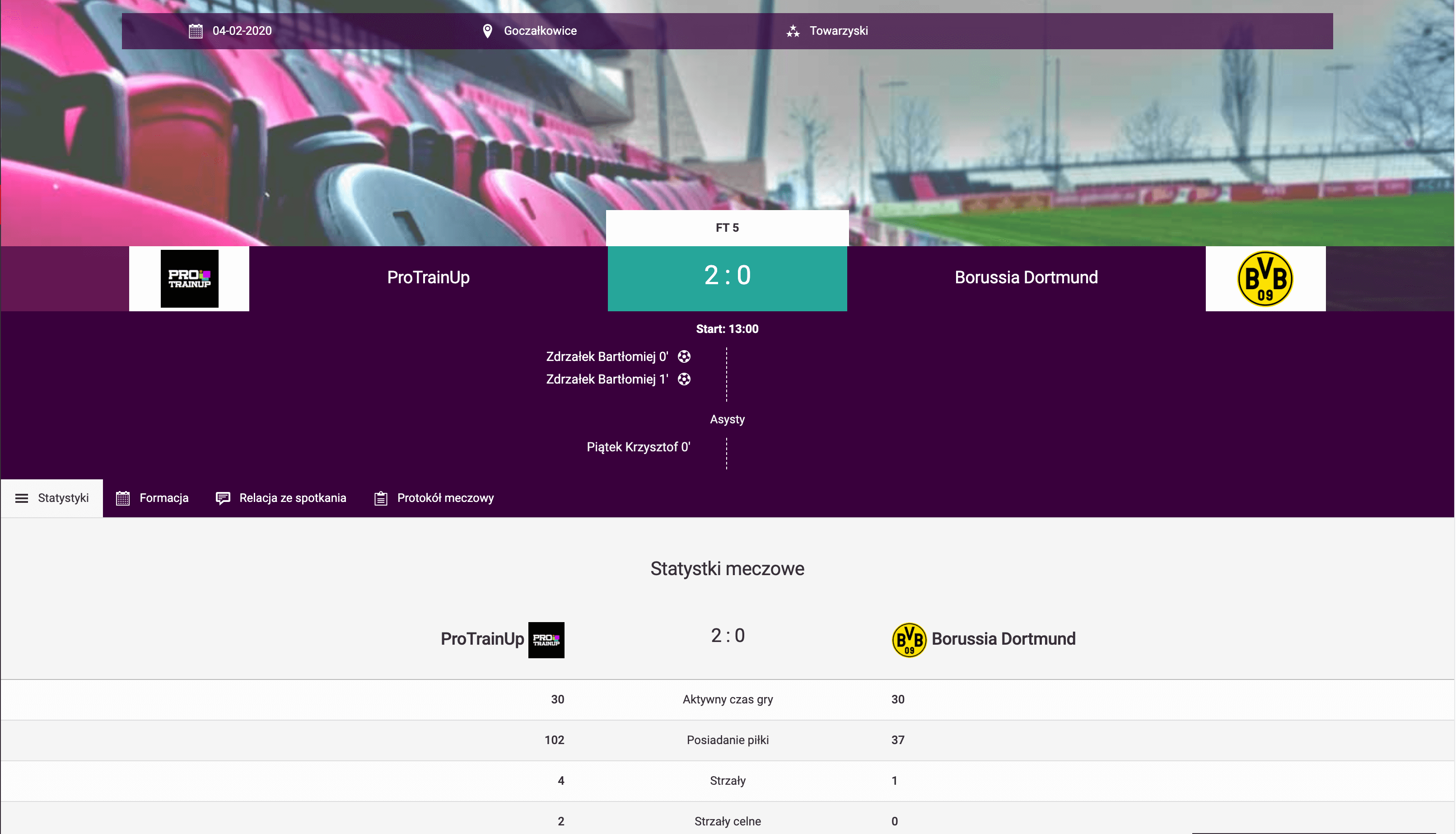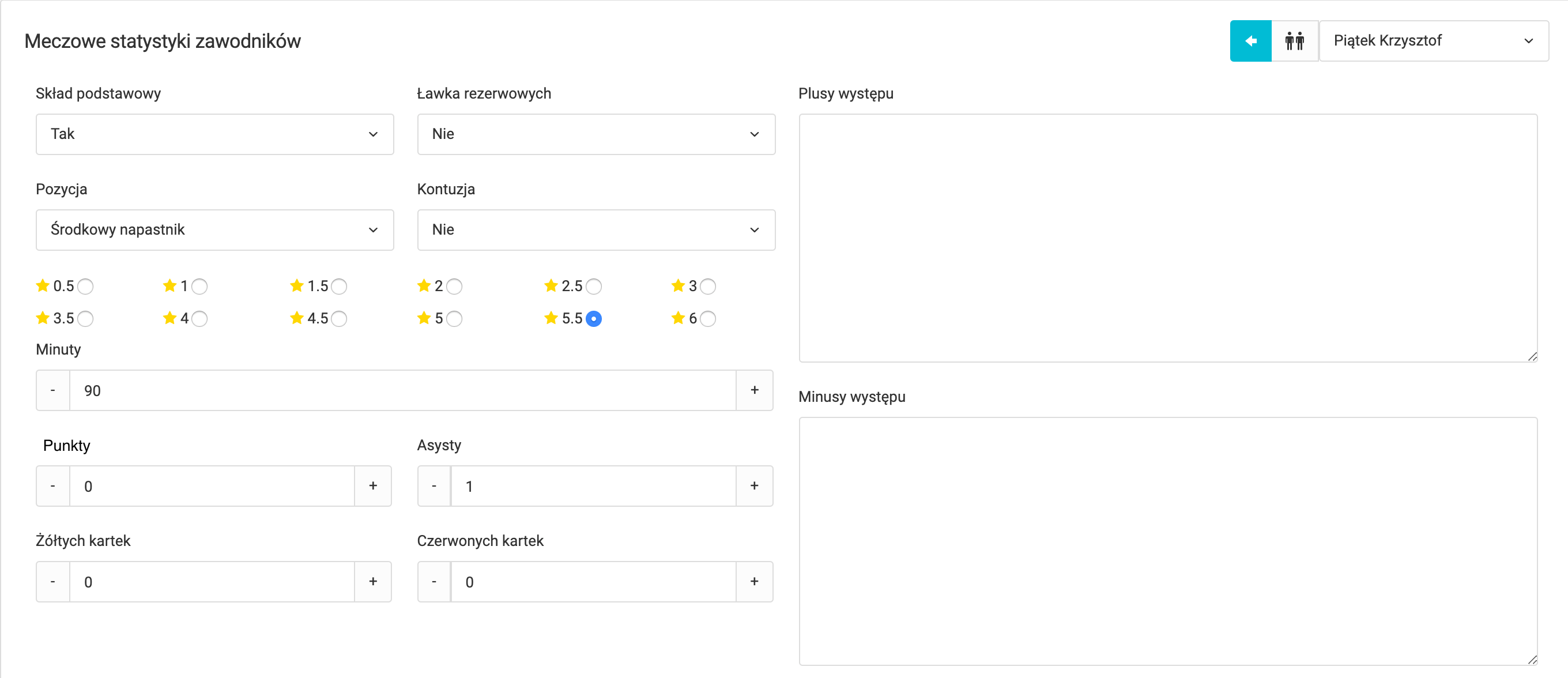 Jak widzisz na powyższym obrazku, z tego miejsca możesz ręcznie wprowadzić indywidualne statystyki zawodnika. Poza podstawowymi elementami jak strzelone bramki czy zdobyte punkty, możesz dodać informację o minutach na boisku, asystach oraz karach. Ponadto możesz wystawić zawodnikowi ocenę za występ w meczu oraz opisać plusy i minusy występu w meczu. Efektem końcowym uzupełnionych statystyk meczowych jest pełna relacja z meczu.