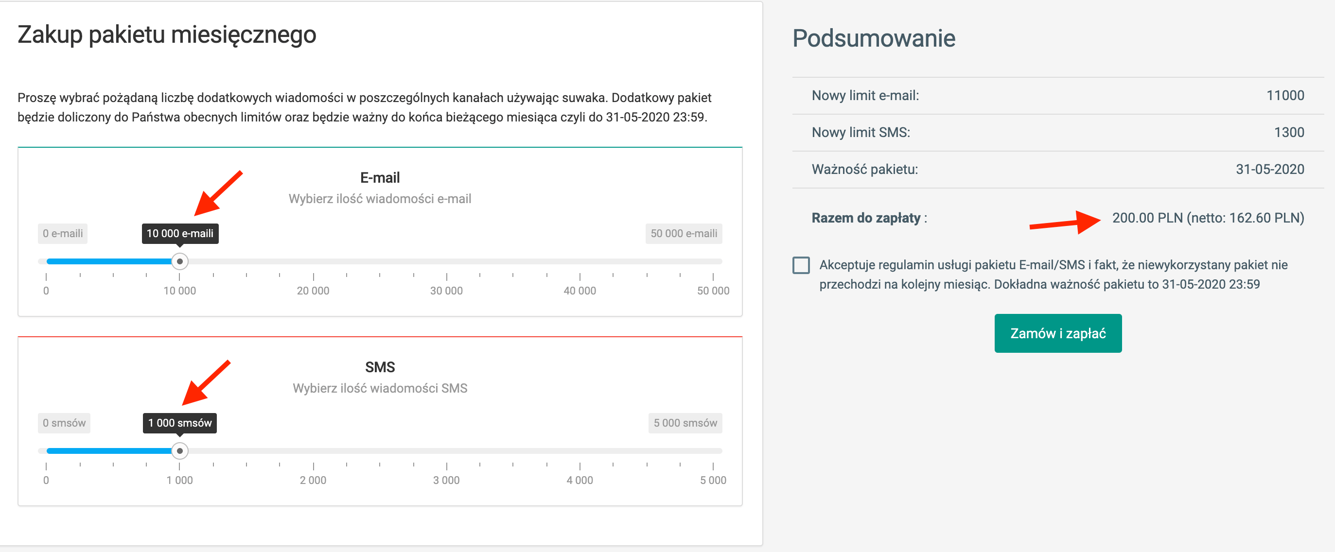 Aby zakupić dodatkowy pakiet wiadomości, przesuń suwakami i wybierz ile sms czy e-maili chcesz zakupić. Koszt 1000 sms, to koszt oscylujący w okolicach 100 zł brutto. Podobną kwotę zapłacisz za pakiet 10 000 e-maili. Cena pakietów uzależniona jest od kraju, w którym działa Twój klub. Po wybraniu interesujących Cię pakietów, zaakceptowaniu regulaminu oraz kliknięciu "zamów i zapłać", nie pozostaje Ci nic innego jak dokonanie przelewu poprzez Przelewy24. Twój pakiet będzie aktywny niezwłocznie po zaksięgowaniu płatności.