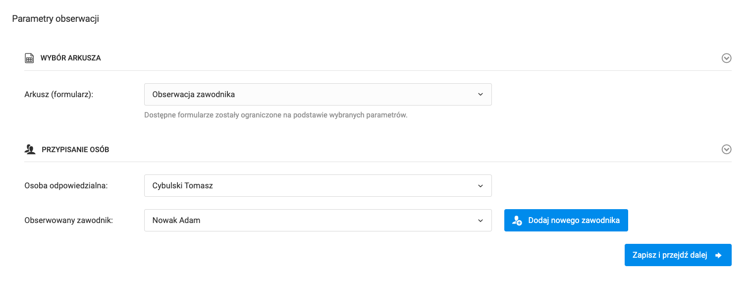 W przypadku obserwacji wewnętrznej będziesz miał do wyboru wyłącznie zawodników/pracowników swojego klubu. Po określeniu wszystkich parametrów, kliknij w przycisk „zapisz i przejdź dalej”.