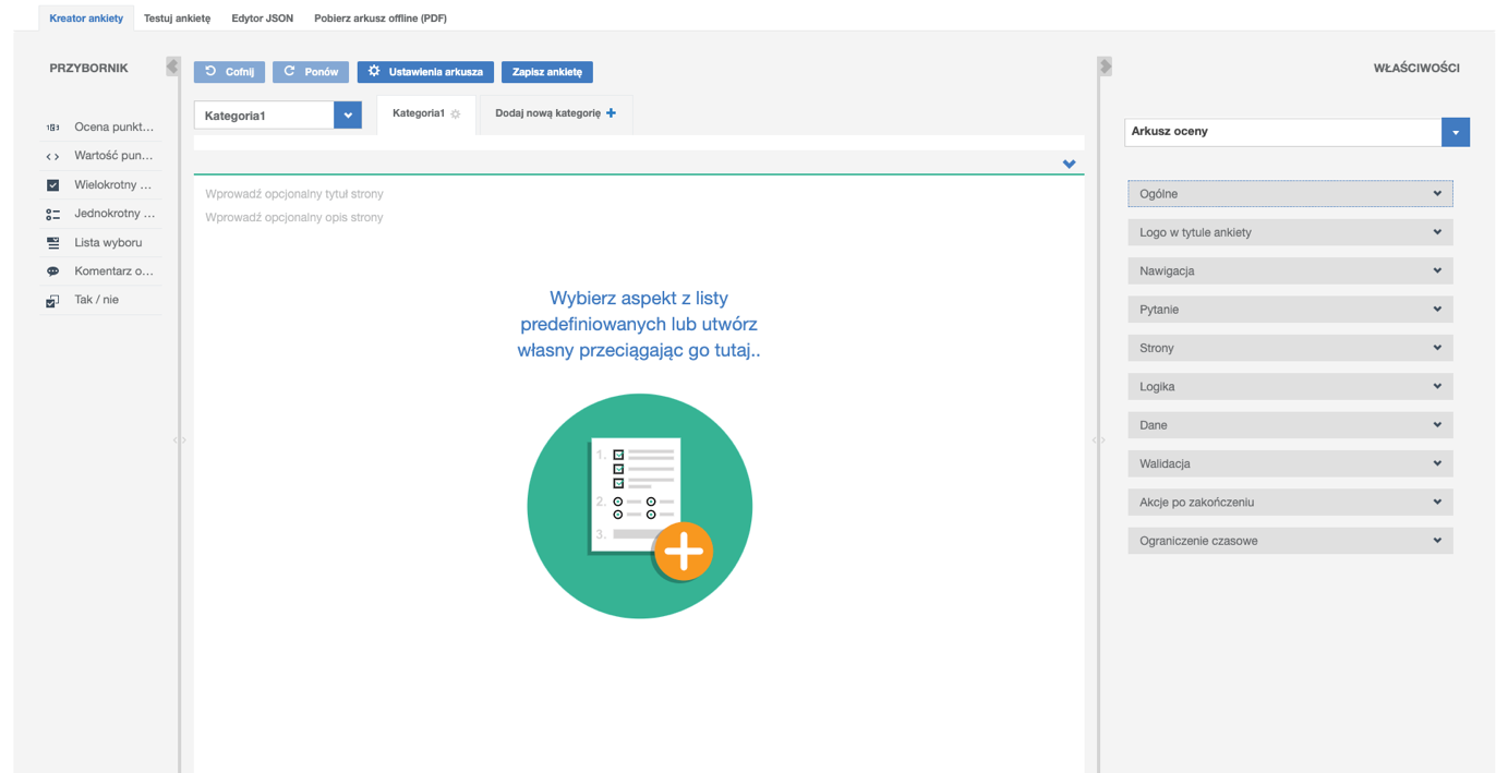 Sam kreator składa się z kilku głównych elementów. Patrząc od lewego górnego rogu, masz do dyspozycji górne menu, gdzie możesz skorzystać z kilku opcji m.in. pobranie formularza w formie pliku PDF oraz wyświetlenie aktualnej wersji formularza do testowania. Także w górnej części kreatora znajdują się zakładki, w których możesz dodawać kolejne „strony” arkusza. Aby dodać nową stronę, kliknij „dodaj nową stronę”. Będzie to skutkowało, tym że w arkuszu utworzą „kroki” uzupełniania formularz, gdzie każdy kolejny „krok” (strona) będzie zawierała dodane do danej strony pola.