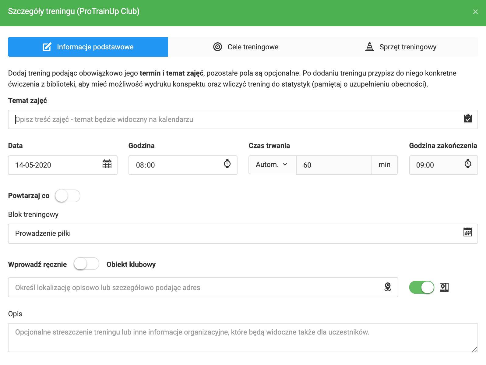 Pierwszym krokiem podczas tworzenia treningu jest nadanie mu nazwy oraz określenie daty, godziny oraz czasu trwania. Czas trwania można ustalić ręcznie lub będzie on zliczany, jako suma czasów wykorzystanych ćwiczeń. Kolejnym krokiem jest określenie miejsca treningu. Możesz je wpisać ręcznie lub wybrać z predefiniowanej listy obiektów, która tworzona jest w module obiektów.
