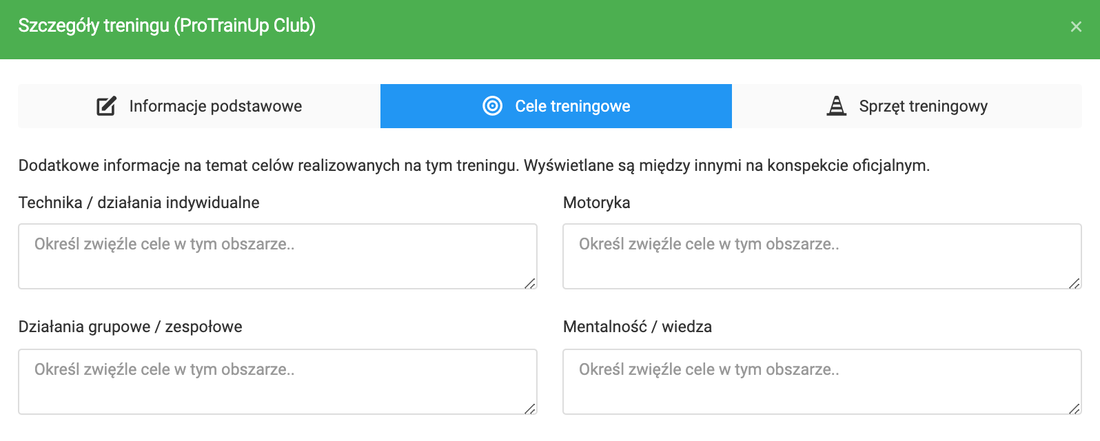 Następnym krokiem jest określenie celów treningowych. Są one podzielone na cztery typy: technika, motoryka, działania grupowe oraz mentalność. Ostatnim krokiem jest ustalenie potrzebnego sprzętu, domyślnie jest on generowany z dodanych do danego treningu ćwiczeń.