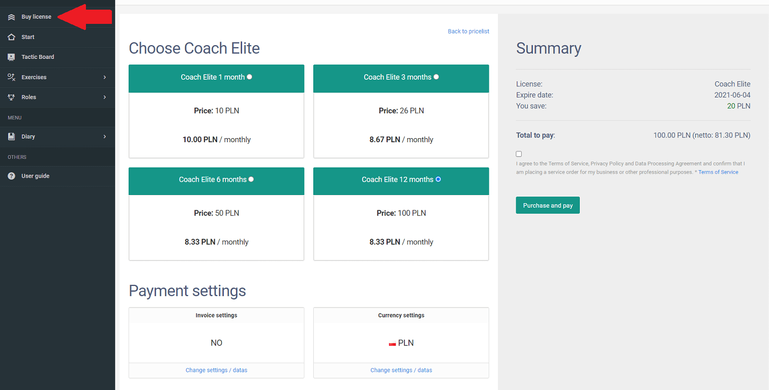 Antes de comprar uma licença, você pode desfrutar de nossa conta Coach Free. Você pode saber mais sobre a licença em lista de preços. Se você decidir comprar uma licença individual, deve ter uma conta de treinador ativa. Após fazer login no sistema, selecione a opção "comprar licença" no menu à esquerda. Selecione o pacote que lhe interessa e seu período de validade. Se você precisar de uma fatura, preencha os dados necessários e prossiga para o pagamento. O pagamento é feito através da plataforma de pagamento - DotPay. Sua licença estará ativa imediatamente após seu pagamento ser creditado por nós.