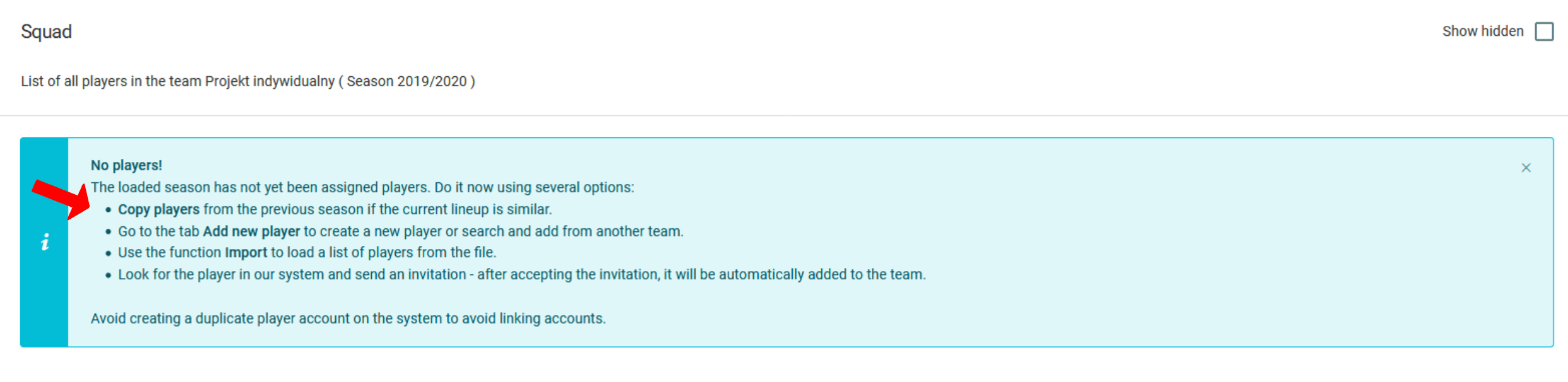 Após criar a próxima temporada em sua equipe, ao entrar na aba diário jogadores elenco você notará a falta de uma lista de jogadores. Esta situação é intencional e completamente normal. Graças à função de cópia de jogadores da temporada anterior, na nova temporada você terá apenas jogadores que realmente permaneceram em sua equipe na nova temporada.