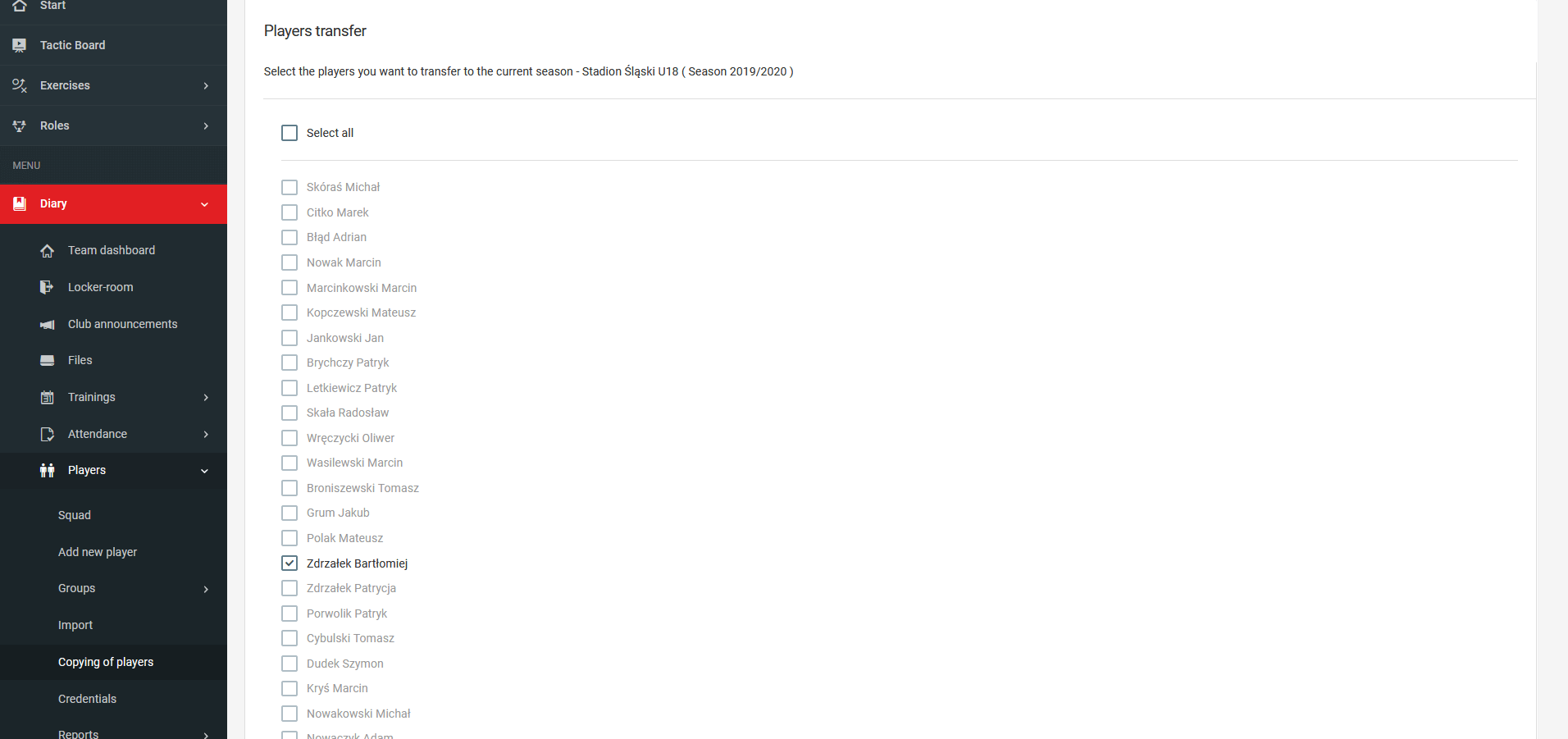 Para começar a copiar jogadores da temporada anterior, clique no texto em negrito "copiar jogadores" como na imagem acima ou clique no menu à esquerda em diário jogadores cópia de jogadores.