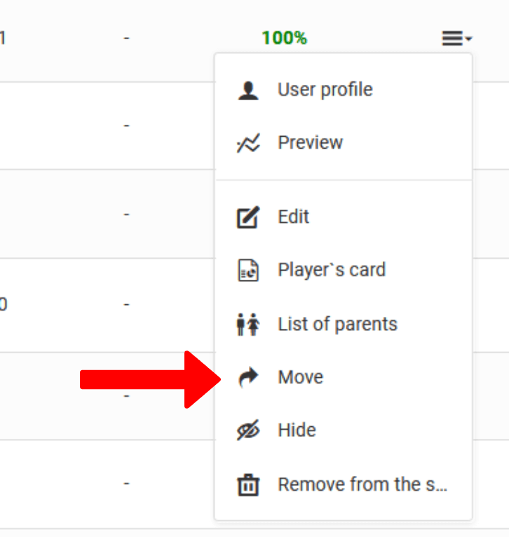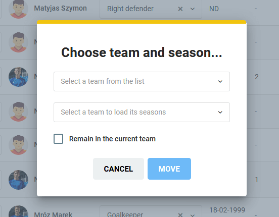 O sistema oferece a possibilidade de copiar/transferir jogadores entre equipes dentro de uma entidade. Você tem duas opções de copiar ou transferir um jogador. Para fazer isso, você precisa selecionar a opção "mover" no menu do jogador.