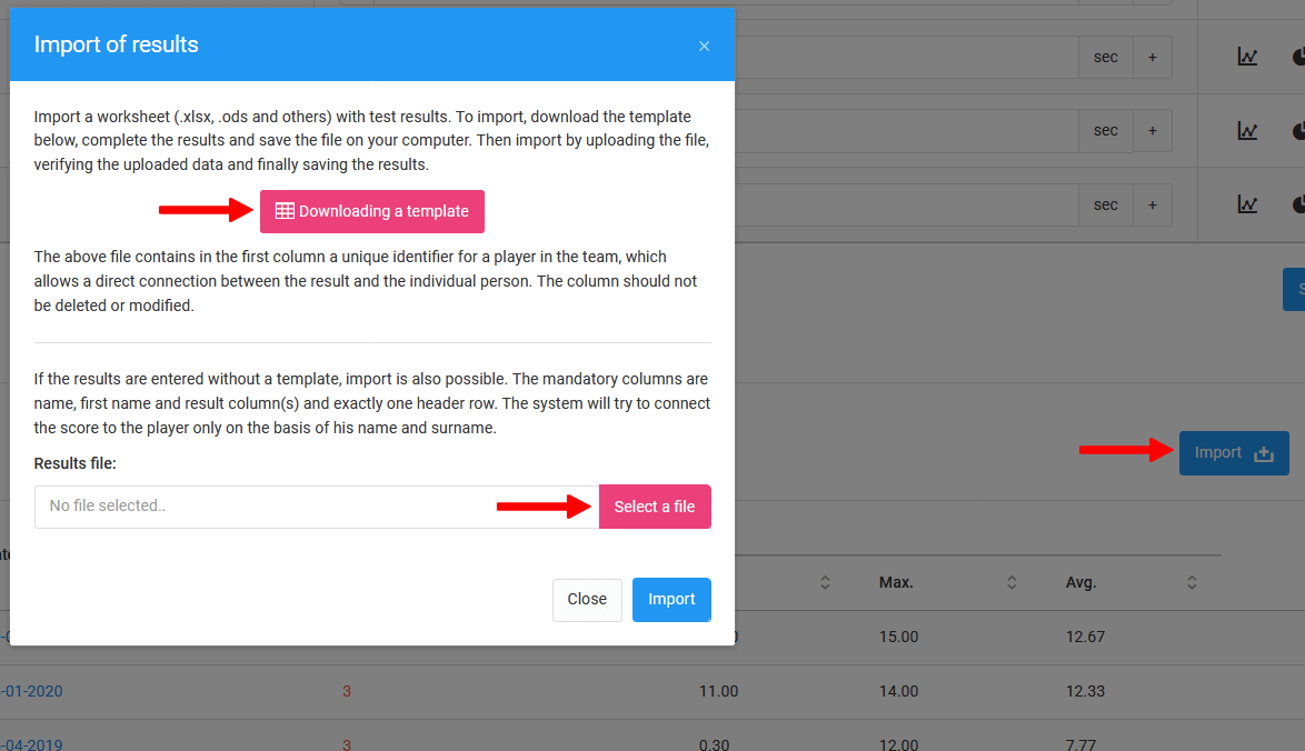 O sistema permite carregar resultados de testes de um arquivo xls previamente preparado. Para fazer isso, clique no ícone azul "importar" na janela de entrada de resultados do teste. O clique abrirá uma janela, onde você pode baixar o modelo do arquivo ou carregar o arquivo xls já preenchido. Para garantir que os dados serão bem lidos e atribuídos aos respectivos jogadores, recomendamos usar um arquivo xls modelo.