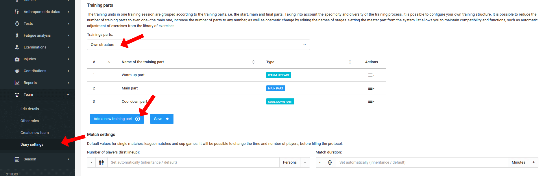 O sistema oferece a oportunidade de criar sua própria estrutura de rascunho. Por padrão, existem três partes de treino no rascunho: as partes inicial, principal e final. Com este recurso, você pode definir qualquer número e ordem de partes do treino. As partes podem ser definidas a partir do nível do clube e então herdadas pelas equipes ou criadas individualmente para uma equipe específica. Você pode definir sua própria estrutura de rascunho na aba diário equipe configurações do diário.
