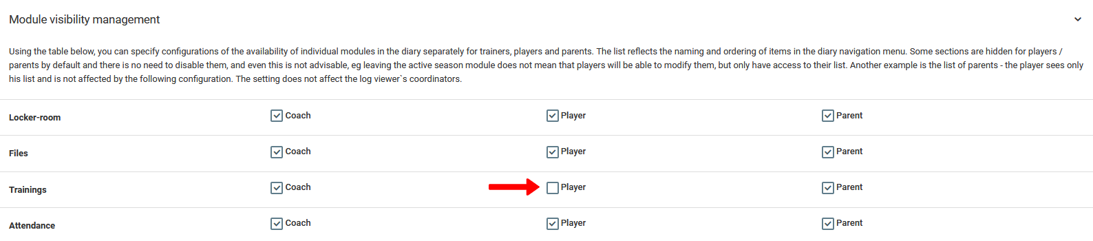 Другим элементом настроек, влияющим на значительную часть системы, является модуль скрытия элементов дневника для отдельных групп пользователей. Чтобы скрыть или показать модуль для выбранной группы пользователей, перейдите в левое меню клуб настройки спрятать модули. Как вы можете видеть на рисунке ниже, управление видимостью модуля основано на выборе или отмене выбора выбранных элементов и функциональности журнала. Если снять этот флажок, он исчезнет из меню в учетных записях выбранной группы пользователей. В случае, показанном на рисунке, участники соревнования заблокировали доступ к вкладке тренировки. Помните, что эти настройки применяются ко всем пользователям в данной группе в сущности, которой вы управляете.