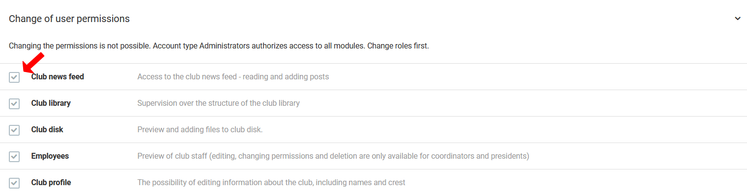 Da pridete do dovoljenj zaposlenega, pojdite v levem meniju na klub zaposleni seznam zaposlenih in v zadnji vrstici poleg zaposlenega kliknite na "dovoljenja". Od tukaj lahko tudi izbrišete zaposlenega s klikom na izbiro "izbriši" v meniju.