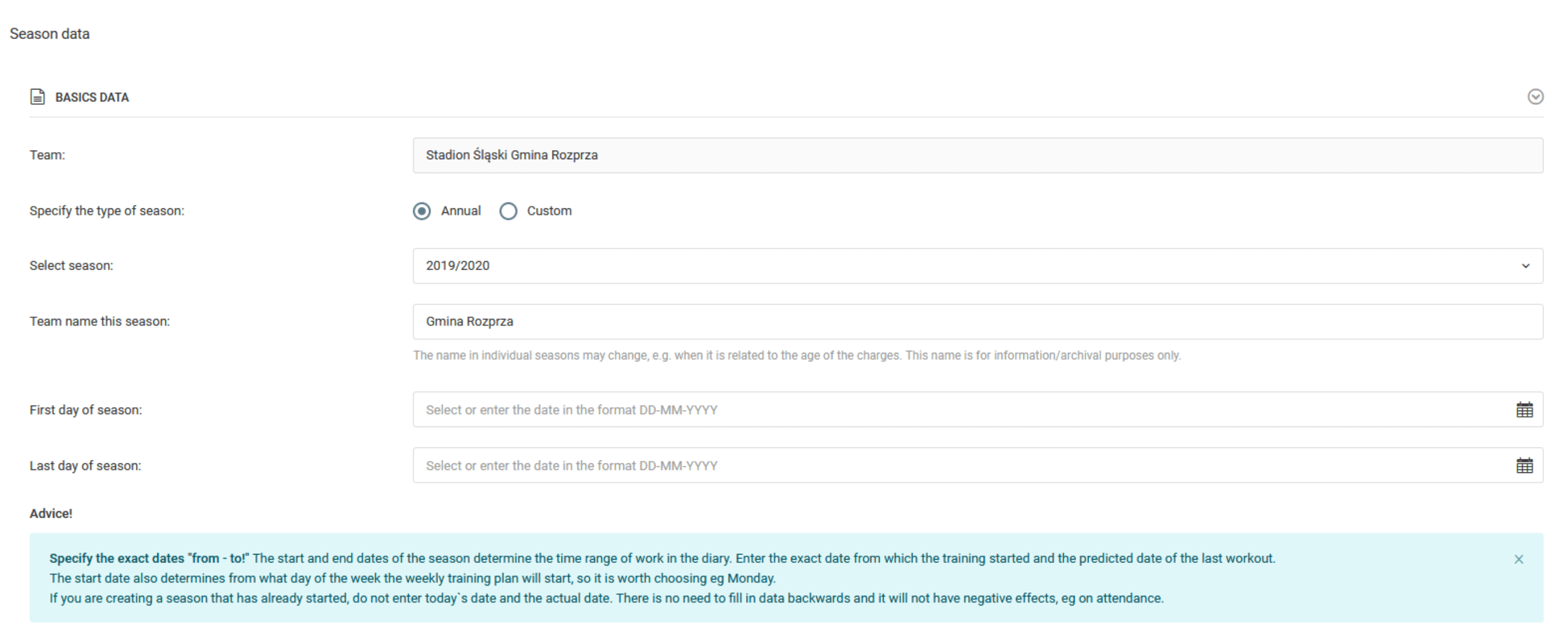 Da ustvarite sezono v sistemu, kliknite na levi meni: dnevnik sezone dodaj sezono. Nato boste videli obrazec za ustvaritev nove sezone. Tam boste našli nekaj polj, ki jih morate izpolniti, začenši z izbiro s seznama sezone, npr. 2020/2021, nato nastavite ime ekipe za to sezono in izberite začetni in končni datum sezone. Priporočamo, da ustvarite letne sezone, vendar vam sistem dovoljuje, da dodate krajše sezone, ki se imenujejo sezone po meri, v izjemnih primerih.