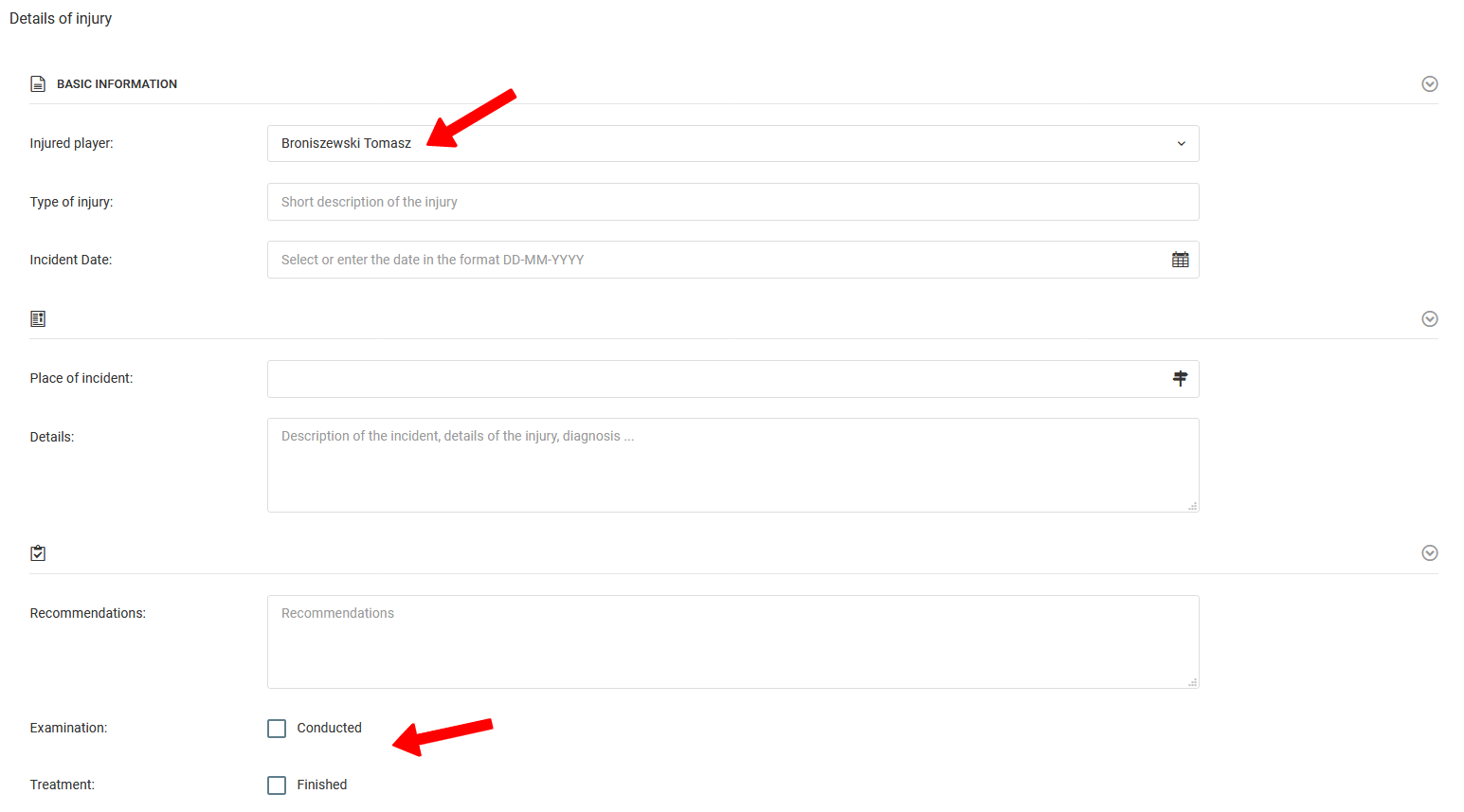 Da dodate poškodbo, iz levega menija izberite dnevnik poškodbe dodaj poškodbo. Izpolnite podatke zahtevane v prikazanem obrazcu, začenši z imenom poškodovanega igralca. Vnesena poškodba je lahko spremenjena kadarkoli, npr. nastavitev datuma pregleda ali zaključka zdravljenja.
