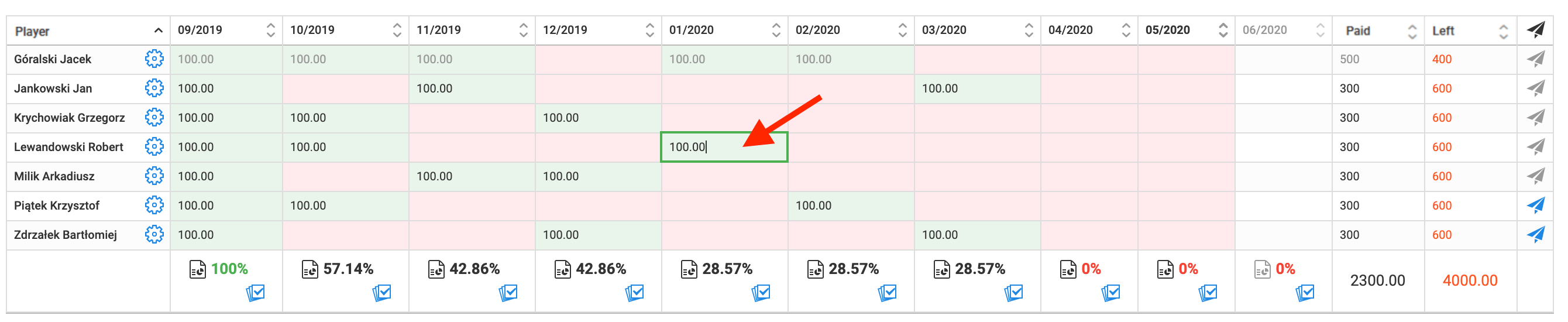 Щоб позначити виплачену премію, вам просто потрібно двічі клацнути (або клацнути правою кнопкою миші - заплатити) у клітинці, де вказана сума, що підлягає сплаті за даного гравця за певний місяць. Після натискання клітинка покаже суму, яка стосується гравця. Якщо сума депозиту відрізняється від значення за замовчуванням, введіть суму в комірку, ввівши значення вручну.