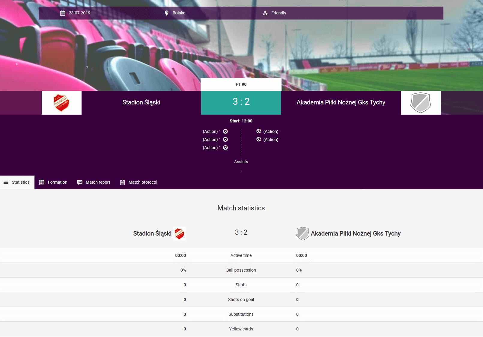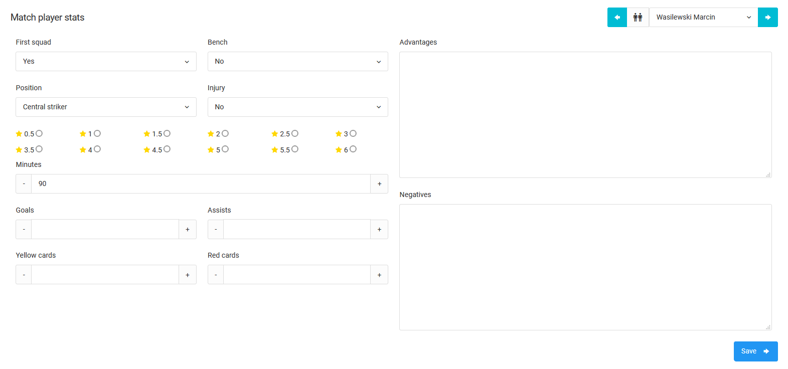 Як ви можете бачити на малюнку вище, звідси ви можете вручну вводити статистику окремих гравців. На додаток до основних елементів, таких як забиті голи чи набрані очки, ви можете додати інформацію про хвилини на полі, передачі та пенальті. Крім того, ви можете оцінити гравця за його виступ у матчі та описати плюси та мінуси виступу в матчі. Кінцевим результатом заповненої статистики матчів є повний звіт про матчі.